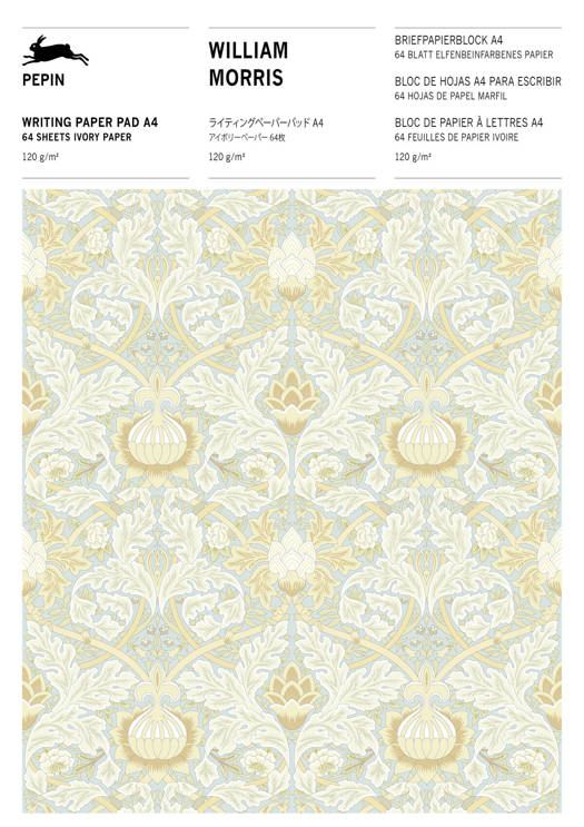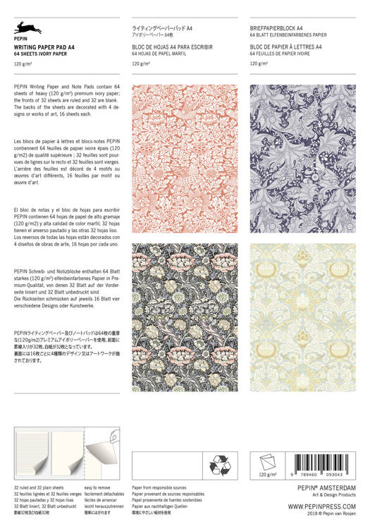 Each PEPIN Writing Paper and Note Pads contains 64 sheets of heavy (120 g/m2) premium ivory paper; the fronts of 32 sheets are ruled and 32 are blank. The backs of the sheets are decorated with 4 designs or works of art, 16 sheets each.