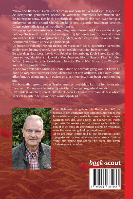 ‘Wuivende halmen’ is een streekroman waarvan het verhaal zich afspeelt in de Kempische gemeenten Beerse en Vosselaar, omstreeks het midden van de twintigste eeuw. Het boek beschrijft de jeugdperikelen van twee bengels, Suskewiet en zijn vriend Charel. Suske is een bijzonder intelligent kereltje, Charel echter, die is wat eenvoudig van geest.Hun grappige belevenissen en hun deugnietenstreken wekken vaak de slappe lach op. Toch weet ik zeker dat menigeen bij het lezen van dit boek af en toe ook wel een traan zal wegpinken. De kinderlijke denkwijze van Suske en Charel herinneren ons aan onze eigen kindertijd.De bekende volksfiguren uit Beerse en Vosselaar, die ik sporadisch vernoem, spelen geen belangrijke rol, maar geven wel kleur aan het hele verhaal.Zo zijn daar Sooi Leys, Lewis van Pollekes, Ketjenboer, Koob Steek, Karel den boswachter, Marieke en Lowieke Verschueren, Kloon Nagels, Fien Schilder, Scheel Jeanne, Felix de kruidenier, Moeder Diels, Mie Broos, Sus Wens en Weutske de gazettenman.Als de twee vrienden Suske en Charel, door de normale gang van het leven en door de weg naar volwassenheid elkaar uit het oog verliezen, gaat voor Charel alles fout. De relatie met zijn ouders en zijn omgeving, niets heeft voor hem nog zin.Als bovendien grootmoeder Traske komt te overlijden, kan hij het leven niet meer aan. Traske was de enige bij wie Charel wat geborgenheid voelde.Het einde is voor hem een vlucht uit het leven. Helemaal overmand door verdriet, verkiest hij uiteindelijk voor een wanhoopsdaad.