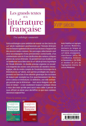 Cette anthologie a pour ambition de revenir sur des textes du XVIIe siècle rapidement panthéonisés par l’histoire littéraire tout en faisant également découvrir aux lecteurs d’aujourd’hui des œuvres moins connues. Des passages sélectionnés sont ainsi accompagnés d’une présentation contextuelle, d’un commentaire suivi et d’une clarification des notions critiques phares du cursus littéraire : ils permettront aux étudiants de se familiariser aussi bien avec le XVIIe siècle qu’avec la pratique de l’étude littéraire. Un double principe organise ce recueil : si la majorité des textes sont présentés de manière chronologique, afin de rendre compte de l’évolution historique de la littérature du xviie siècle, sont parfois privilégiés des regroupements en fonction d’une identité générique (les écrivains de mœurs par exemple) ou d’un questionnement (les liens entre science et littérature). En définitive, une telle anthologie postule que la littérature – tout aussi éloignée soit-elle dans le temps – a non seulement toujours quelque chose à nous dire mais qu’elle peut aussi nous aider à penser en nous offrant un miroir pour déchiffrer ce que nous sommes (devenus) aujourd’hui.