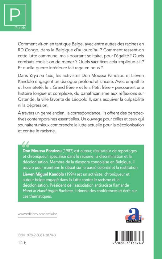 Dans Yaya na Leki, les activistes Don Moussa Pandzou et Lieven Kandolo engagent un dialogue profond et sincère. Avec empathie et honnêteté, le « Grand frère » et le « Petit frère » parcourent une histoire longue et complexe, du panafricanisme aux réflexions sur Ostende, la ville favorite de Léopold II, sans esquiver la culpabilité ni la dépression.