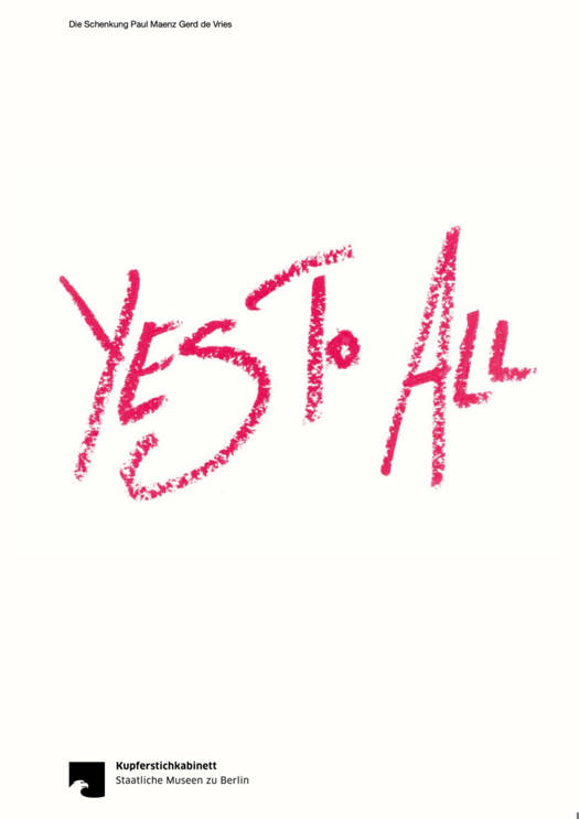 Die ehemaligen Kölner Galeristen Paul Maenz und Gerd de Vries machten dem Berliner Kupferstichkabinett bereits zum zweiten Mal ein großartiges Geschenk: 900 Arbeiten auf Papier-Zeichnungen, Skizzen, Druckgrafik, Collagen, Briefe und Postkarten von über 90 namhaften internationalen Künstler:innen. In diesem Katalog sind ca. 200 Werke der Schenkung abgebildet, eine Auswahl welche die Vielfalt der Sammlung bezeugt: von konzeptueller Kunst der 60er zur italienischen Transavangarde der 70er, zu den Neuen Wilden der 80er hin zu zeitgenössischen Positionen. Mit einem Cover von Sylvie Fleury (auch der Titel Yes to All ist ihrem Werk entliehen), Essays und einem Gespräch mit Maenz und de Vries illustriert das Buch ein vielstimmiges und gegensätzliches Geflecht der postmodernen westlichen Kunst.