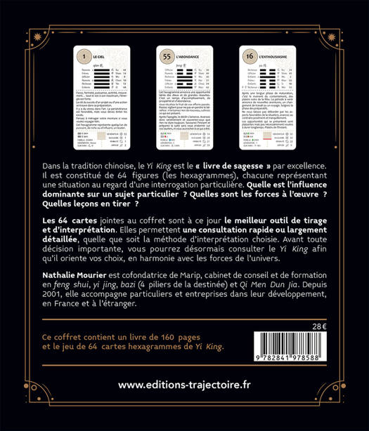 Dans la tradition chinoise, le Yi King est le « livre de sagesse » par excellence. Il est constitué de 64 figures (les hexagrammes), chacune représentant une situation au regard d'une interrogation particulière. Quelle est l'influence dominante sur un sujet particulier ? Quelles sont les forces à l'œuvre ? Quelles leçons en tirer ? Les 64 cartes jointes au coffret sont à ce jour le meilleur outil de tirage et d'interprétation. Elles permettent une consultation rapide ou largement détaillée, quelle que soit la méthode d'interprétation choisie. Avant toute décision importante, vous pourrez désormais consulter le Yi King afin qu'il oriente vos choix, en harmonie avec les forces de l'univers.