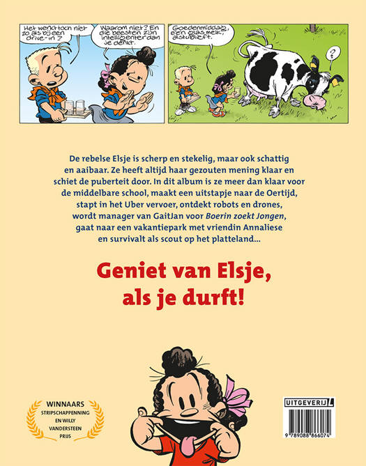 Elsje is lief, keihard, meedogenloos, schattig en breekbaar. Dat levert een smakelijk humoristische strip op. In dit album loopt ze op tegen drones en ubers, kampeert ze met de scouting, gaat terug naar de oertijd, en worstelt zoals altijd met vrienden, vriendinnen, ouders en school. Elsje wordt in binnenland en buitenland gepubliceerd, ontving de Willy Vandersteen Prijs en tweemaal de Strippenning voor beste jeugdalbum.