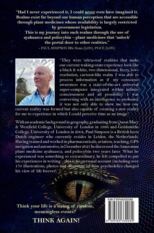 With an academic background in geography graduating from Queen Mary & Westfield College, University of London in 1996 and Goldsmiths College, University of London in 2004, Paul Simpson is a British born Dutch engineer who currently resides in Leiden, The Netherlands. Having trained and worked in pharmaceuticals, aviation, teaching, GPS navigation, and automotive, in December 2021 he discovered the Amazonian plant medicine ayahuasca, and psilocybin two years later. What Paul experienced during his five psychedelic journeys over a three year period was so extraordinary, he felt compelled to put them in writing — this is his personal account (including over 170 illustrations, photos and diagrams) of each of his five psychedelic journeys and how psychedelics changed his view of life forever!