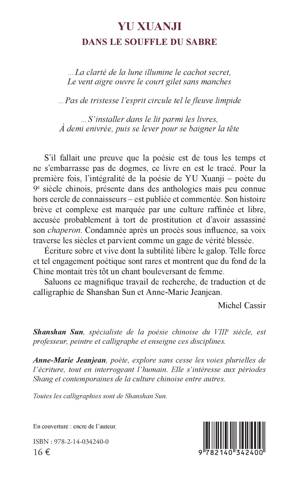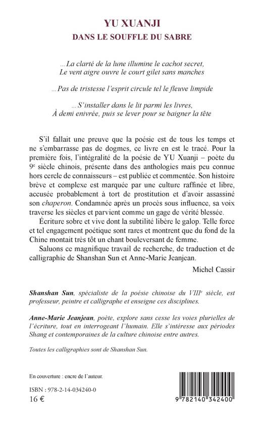 La clarté de la lune illumine le cachot secret, Le vent aigre ouvre le court gilet sans manches Pas de tristesse l'esprit circule tel le fleuve limpide S'installer dans le lit parmi les livres, À demi enivrée, puis se lever pour se baigner la tête S'il fallait une preuve que la poésie est de tous les temps et ne s'embarrasse pas de dogmes, ce livre en est le tracé. Pour la première fois, l'intégralité de la poésie de YU Xuanji poète du 9e siècle chinois, présente dans des anthologies mais peu connue hors cercle de connaisseurs est publiée et commentée. Son histoire brève et complexe est marquée par une culture raffinée et libre, accusée probablement à tort de prostitution et d'avoir assassiné son chaperon. Condamnée après un procès sous influence, sa voix traverse les siècles et parvient comme un gage de vérité blessée. Écriture sobre et vive dont la subtilité libère le galop. Telle force et tel engagement poétique sont rares et montrent que du fond de la Chine montait très tôt un chant bouleversant de femme. Saluons ce magnifique travail de recherche, de traduction et de calligraphie de Shanshan Sun et Anne-Marie Jeanjean. Michel Cassir