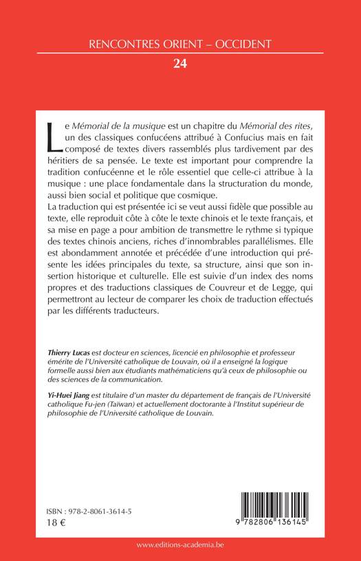 Le Mémorial de la musique est un chapitre du Mémorial des rites, un des classiques confucéens attribué à Confucius mais en fait composé de textes divers rassemblés plus tardivement par des héritiers de sa pensée. Le texte est important pour comprendre la tradition confucéenne et le rôle essentiel que celle-ci attribue à la musique : une place fondamentale dans la structuration du monde, aussi bien social et politique que cosmique.