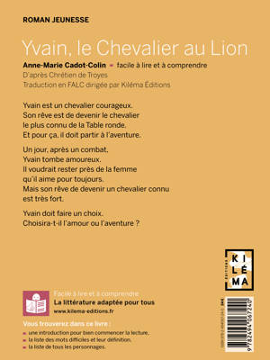 UN LIVRE FACILE À LIRE ET À COMPRENDRE Yvain est un chevalier courageux. Son rêve est de devenir le chevalier le plus connu de la Table ronde. Et pour ça, il doit partir à l’aventure. Un jour, après un combat, Yvain tombe amoureux. Il voudrait rester près de la femme qu’il aime pour toujours. Mais son rêve de devenir un chevalier connu est très fort. Yvain doit faire un choix. Choisira-t-il l’amour ou l’aventure ?