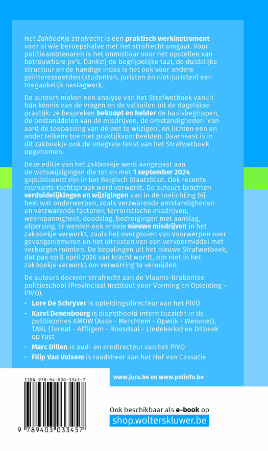 Voor al wie beroepshalve met het strafrecht omgaat, is dit zakboekje een bijzonder praktisch werkinstrument. Dankzij de begrijpelijke taal, de duidelijke structuur en de handige index is het ook voor andere geïnteresseerden (studenten, juristen én niet-juristen) een toegankelijk naslagwerk.