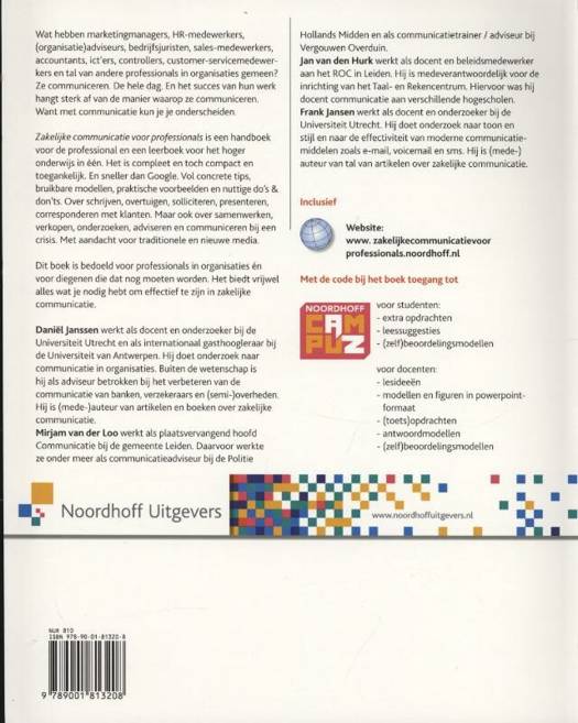 biedt veel concrete tips, bruikbare modellen, voorbeelden uit de praktijk en nuttige do's & don'ts. Zowel in het boek als op de bijbehorende website worden praktische oefeningen aangeboden. Elk hoofdstuk bevat bovendien modellen voor zelfreflectie en (zelf)evaluatie. Deze unieke aanpak maakt Zakelijke communicatie voor professionals tot een handboek voor professionals en een studieboek voor het hoger onderwijs in één. Het biedt alles wat de huidige student nodig heeft om straks effectief te zijn in zakelijke communicatie.Op de bijbehorende website www.zakelijkecommunicatievoorprofessionals.noordhoff.nl staat aanvullend studiemateriaal.