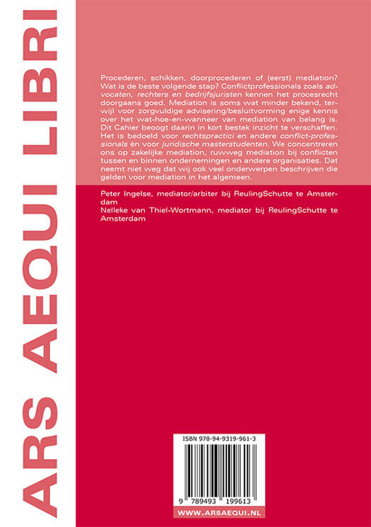 Procederen, schikken, doorprocederen of (eerst) mediation? Wat is de beste volgende stap? Conflictprofessionals zoals advocaten, rechters en bedrijfsjuristen kennen het procesrecht doorgaans goed. Mediation is soms wat minder bekend, terwijl voor zorgvuldige advisering/besluitvorming enige kennis over het wat-hoe-en-wanneer van mediation van belang is. Dit Cahier beoogt daarin in kort bestek inzicht te verschaffen. Het is bedoeld voor rechtspractici en andere conflict-professionals èn voor juridische masterstudenten. De auteurs concentreren zich op zakelijke mediation, ruwweg mediation bij conflicten tussen en binnen ondernemingen en andere organisaties. Dat neemt niet weg dat zij ook veel onderwerpen beschrijven die gelden voor mediation in het algemeen.