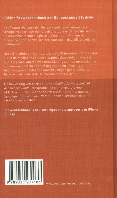 Deze 31e editie omvat meer dan 40.000 termen en afkortingen die in de medische en aanverwante vakgebieden gangbaar zijn. Op grond van recente ontwikkelingen in de geneeskunde zijn nieuwe (internationale) begrippen en afkortingen toegevoegd en bestaande omschrijvingen geactualiseerd. In deze druk is de DSM-5-classificatie verwerkt. De bewerking van deze editie van Coëlho Zakwoordenboek der Geneeskunde, oorspronkelijk samengesteld door M.B. Coëlho, was in handen van A.A.F. Jochems, medisch bioloog/oud-docent, en F.W.M.G. Joosten, arts/oud-docent/oud-verpleegkundige.