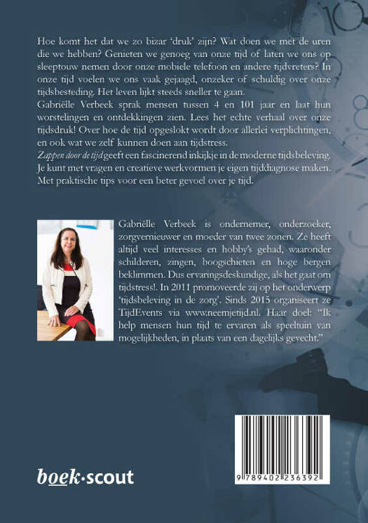 Hoe komt het dat we zo bizar ‘druk’ zijn? Wat doen we met de uren die we hebben? Genieten we genoeg van onze tijd of laten we ons op sleeptouw nemen door onze mobiele telefoon en andere tijdvreters? In onze tijd voelen we ons vaak gejaagd, onzeker of schuldig over onze tijdsbesteding. Het leven lijkt steeds sneller te gaan.Gabriëlle Verbeek sprak mensen tussen 4 en 101 jaar en laat hun worstelingen en ontdekkingen zien. Lees het echte verhaal over onze tijdsdruk! Over hoe de tijd opgeslokt wordt door allerlei verplichtingen, en ook wat we zelf kunnen doen aan tijdstress.Zappen door de tijd geeft een fascinerend inkijkje in de moderne tijdsbeleving. Je kunt met vragen en creatieve werkvormen je eigen tijddiagnose maken. Met praktische tips voor een beter gevoel over je tijd.