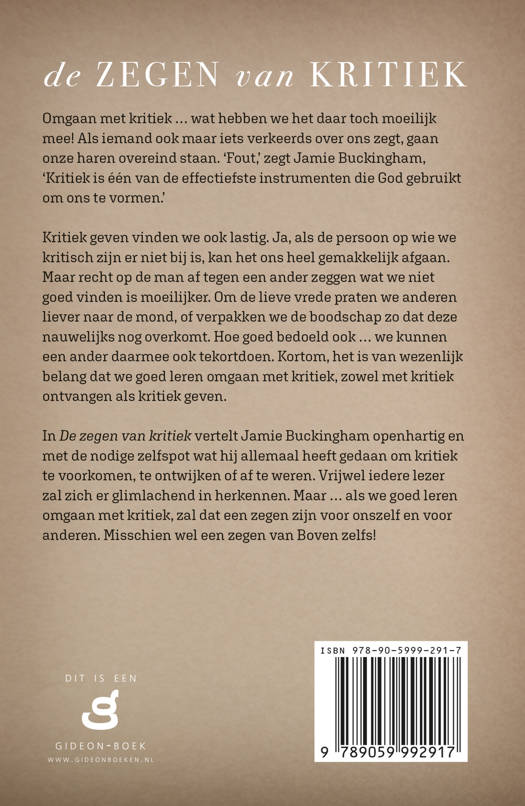 Omgaan met kritiek… wat hebben we het daar toch moeilijk mee! Als iemand ook maar iets verkeerds over ons zegt, gaan onze haren overeind. ‘Fout!’ zegt Jamie Buckingham, ‘kritiek is één van de effectiefste instrumenten die God gebruikt om ons te vormen.’ Kritiek geven vinden we ook lastig. Ja, als de persoon op wie we kritisch zijn er niet bij is, kan het ons heel gemakkelijk af gaan. Maar recht op de man af tegen een ander zeggen wat we niet goed vinden is moeilijker. Om de lieve vrede praten we anderen liever naar de mond, of verpakken we de boodschap zo dat deze nauwelijks nog overkomt. Hoe goed bedoeld ook… we kunnen een ander daarmee ook tekortdoen. Kortom, het is van wezenlijk belang dat we goed leren omgaan met kritiek, zowel met kritiek ontvangen als kritiek geven. In De zegen van kritiek vertelt Jamie Buckingham openhartig en met de nodige zelfspot wat hij allemaal heeft gedaan om kritiek te voorkomen, te ontwijken of af te weren. Vrijwel iedere lezer zal zich er glimlachend in herkennen. Maar… als we goed leren omgaan met kritiek, zal dat een zegen zijn voor onszelf en voor anderen. Misschien wel een zegen van Boven zelfs!
