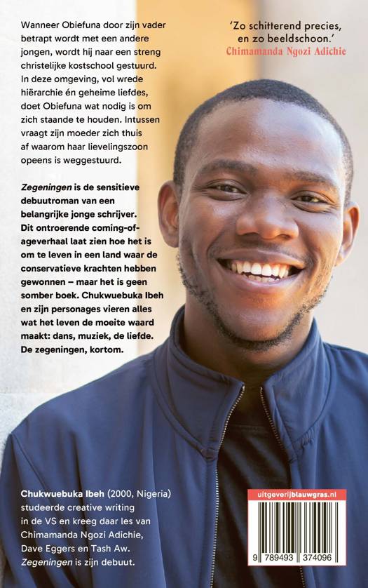 Zegeningen is de sensitieve debuutroman van een belangrijke jonge schrijver. Dit ontroerende coming-of-ageverhaal laat zien hoe het is om te leven in een land waar de conservatieve krachten het voor het zeggen hebben – maar het is geen somber boek. Chukwuebuka Ibeh en zijn personages vieren alles wat het leven de moeite waard maakt: dans, muziek, de liefde. De zegeningen, kortom.