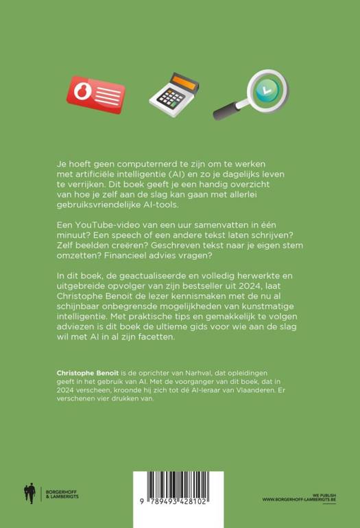 Je hoeft geen computernerd te zijn om te werken met artificiële intelligentie (AI) en zo je dagelijks leven te verrijken. Dit boek geeft je een handig overzicht van hoe je zelf aan de slag kan gaan met allerlei gebruiksvriendelijke AI-tools.