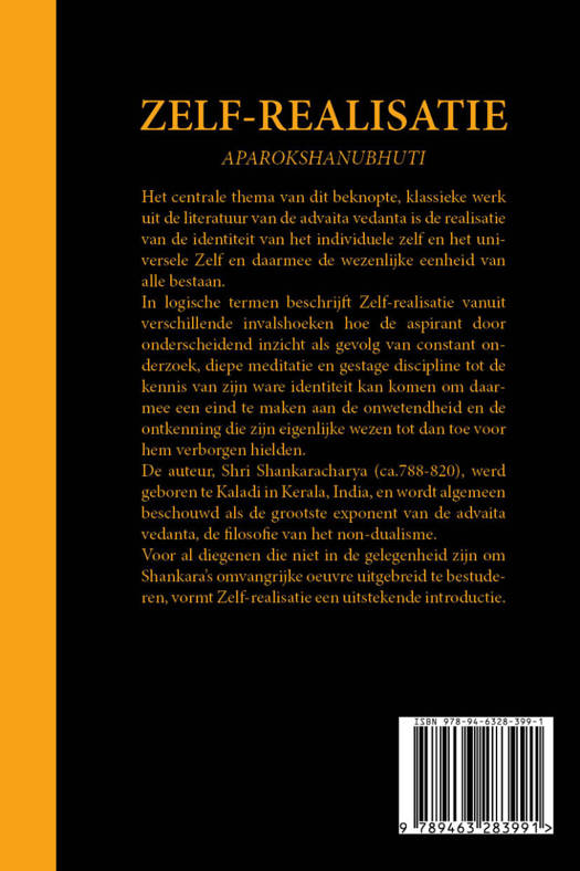 Het centrale thema van dit beknopte, klassieke werk uit de literatuur van de advaita vedanta is de realisatie van de identiteit van het individuele zelf en het universele Zelf en daarmee de wezenlijke eenheid van alle bestaan. In logische termen beschrijft Zelf-realisatie vanuit verschillende invalshoeken hoe de aspirant door onderscheidend inzicht als gevolg van constant onderzoek, diepe meditatie en gestage discipline tot de kennis van zijn ware identiteit kan komen om daarmee een eind te maken aan de onwetendheid en de ontkenning die zijn eigenlijke wezen tot dan toe voor hem verborgen hielden. De auteur, Shri Shankaracharya (ca.788-820), werd geboren te Kaladi in Kerala, India, en wordt algemeen beschouwd als de grootste exponent van de advaita vedanta, de filosofie van het non-dualisme. Voor al diegenen die niet in de gelegenheid zijn om Shankara’s omvangrijke oeuvre uitgebreid te bestuderen, vormt Zelf-realisatie een uitstekende introductie.