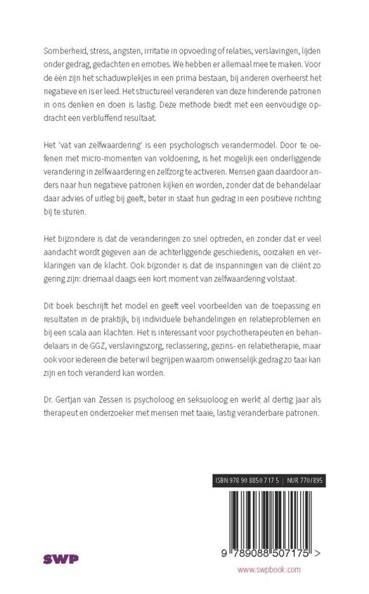 Het ’vat van zelfwaardering’ is een psychologisch verandermodel. Door te oefenen met micro-momenten van voldoening, is het mogelijk een onderliggende verandering in zelfwaardering en zelfzorg te activeren. Mensen gaan daardoor anders naar hun negatieve patronen kijken en worden, zonder dat de behandelaar daar advies of uitleg bij geeft, beter in staat hun gedrag in een positieve richting bij te sturen.