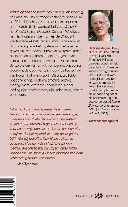 'Zen is opendoen' bevat een selectie van zeventig columns die Dick Verstegen schreef tussen 2002 en 2017. Hij schreef ze als columnist voor o.a. het boeddhistisch kwartaalblad Vorm & Leegte, het Boeddhistisch Dagblad, Centrum Waerbeke, het Han Fortmann Centrum en 'de Wijkkrant' van Nijmegen-Oost. Zijn columns wijzen zonder uitzondering naar het mysterie van het leven en geven blijk van bewogenheid en overgave, maar de lichte toets ontbreekt nooit. Ze gaan over zeer uiteenlopende onderwerpen, zoals: lente, de ware stem van je hart, compassie, ontroering, woorden, de dood van zijn vrouw, de kathedraal van Royan, het windorgel in Vlissingen, liefde, boeddhaschap, bedelen, emoties, relaties, management, overgave, gedachten, Nepal, leerling zijn, theekommen, zijn vader, stilte, licht en opendoen.