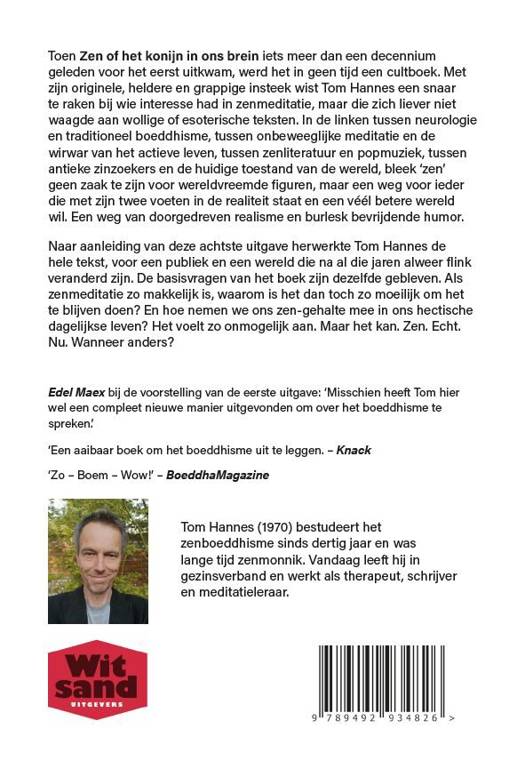 Toen Zen of het konijn in ons brein iets meer dan een decennium geleden voor het eerst uitkwam, werd het in geen tijd een cultboek. Met zijn originele, heldere en grappige insteek wist Tom Hannes een snaar te raken bij wie interesse had in zenmeditatie, maar die zich liever niet waagde aan wollige of esoterische teksten. In de linken tussen neurologie en traditioneel boeddhisme, tussen onbeweeglijke meditatie en de wirwar van het actieve leven, tussen zenliteratuur en popmuziek, tussen antieke zinzoekers en de huidige toestand van de wereld, bleek ‘zen’ geen zaak te zijn voor wereldvreemde figuren, maar een weg voor ieder die met zijn twee voeten in de realiteit staat en een véél betere wereld wil. Een weg van doorgedreven realisme en burlesk bevrijdende humor. Naar aanleiding van deze achtste uitgave herwerkte Tom Hannes de hele tekst, voor een publiek en een wereld die na al die jaren alweer flink veranderd zijn. De basisvragen van het boek zijn dezelfde gebleven. Als zenmeditatie zo makkelijk is, waarom is het dan toch zo moeilijk om het te blijven doen? En hoe nemen we ons zen-gehalte mee in ons hectische dagelijkse leven? Het voelt zo onmogelijk aan. Maar het kan. Zen. Echt. Nu. Wanneer anders?