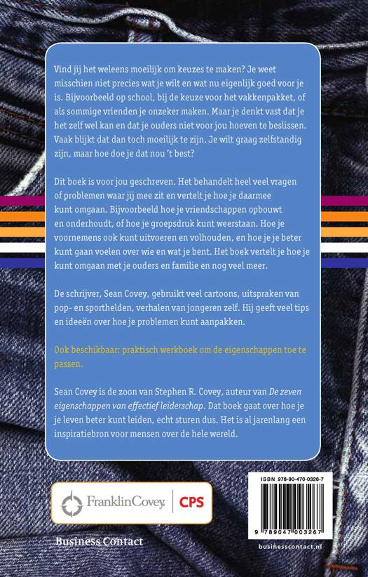 De schrijver, Sean Covey, gebruikt veel cartoons, uitspraken van pop- en sporthelden, verhalen van jongeren zelf. Hij geeft veel tips en ideeën over hoe je problemen kunt aanpakken. Dit boek is vooral voor jou, maar ook je ouders en andere familieleden kunnen er wat van opsteken.Sean Covey is de zoon van Stephen R. Covey, auteur van De zeven eigenschappen van effectief leiderschap. Dat boek gaat over hoe je je leven beter kunt leiden, echt sturen dus. Het is al jarenlang een inspiratiebron.