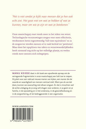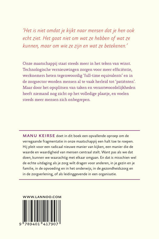 Een opvallende oproep om de verregaande fragmentatie in onze maatschappij een halt toe te roepen Onze maatschappij staat steeds meer in het teken van winst. Technologische vernieuwingen zorgen voor meer efficiëntie, werknemers heten tegenwoordig 'full-time equivalents' en in de zorgsector worden mensen al te vaak herleid tot 'patiënten'. Maar door het opsplitsen van taken en verantwoordelijkheden heeft niemand nog zicht op het volledige plaatje, en voelen steeds meer mensen zich onbegrepen. Manu Keirse doet in dit boek een opvallende oproep om de verregaande fragmentatie in onze maatschappij een halt toe te roepen. Hij pleit voor een radicaal nieuwe manier van kijken, een manier die de waarde en waardigheid van mensen centraal stelt. Want pas als we dat doen, kunnen we waarachtig met elkaar omgaan. En dat is misschien wel de echte uitdaging als je zorg wilt dragen voor anderen, in je gezin en je familie, in de opvoeding en in het onderwijs, in de gezondheidszorg en in de zorgverlening, of als leidinggevende in een organisatie.