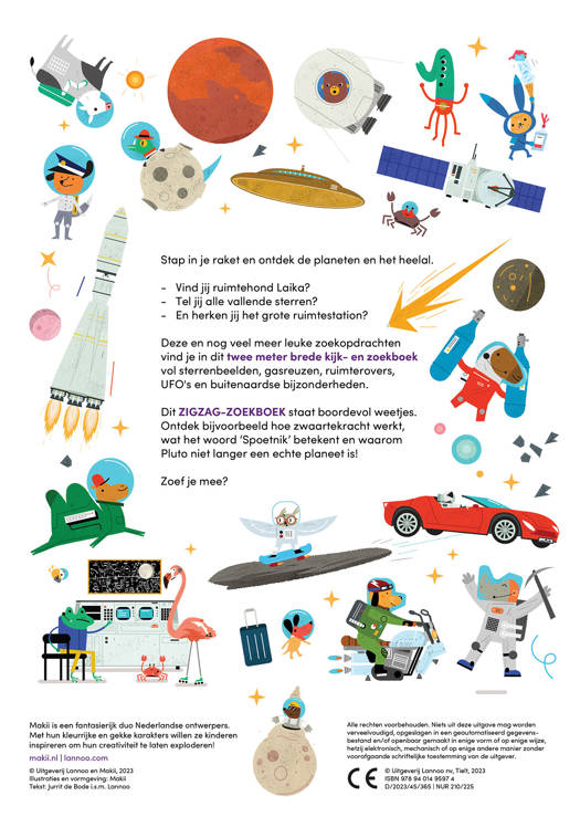 Deze en nog veel meer leuke zoekopdrachten vind je in dit twee meter brede kijk- en zoekboek vol sterrenbeelden, gasreuzen, ruimterovers, UFO's en buitenaardse bijzonderheden.