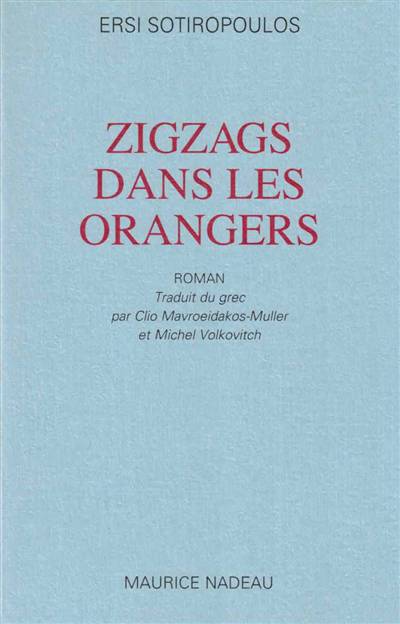 Un été en Grèce de nos jours. Deux lieux : Athènes, un village au bord de la mer. Cinq personnages principaux : une femme gravement malade à l'hôpital ; son frère, un jeune opisif ; un infirmier mal dans sa peau ; une très jeune fille révoltée ; un oiseau qui parle. Roman traduit du grec par Clio Mavroeidakos-Muiler et Michel Volkovitch. 182 p. (ed. française 2003)Zigzags dans les orangers a obtenu le prix du roman de la revue Divazo, en 2000.