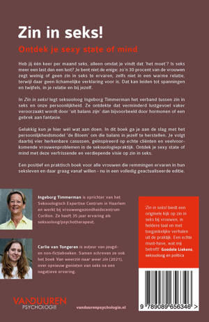In Zin in seks! legt seksuoloog Ingeborg Timmerman het verband tussen zin in seks en onze persoonlijkheid. Ze ontdekte dat verminderd lustgevoel vaker veroorzaakt wordt door ‘uit balans zijn’ dan bijvoorbeeld door hormonen of een gebrek aan fantasie.