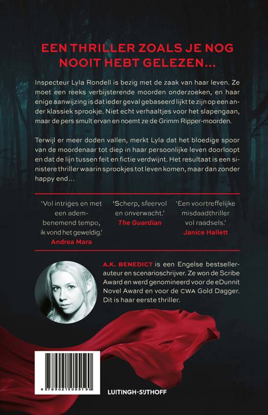 A.K. Benedicts Zo alleen, zo alleen is een 'er was eens' zoals je dat nog nooit hebt gelezen. Er was eens, in een land niet ver van hier, een moordenaar geïnspireerd door sprookjes, op zoek naar bloederig vertier… Rechercheur Lyla Rondell is bezig met de zaak van haar leven. Ze moet een reeks verbijsterende moorden onderzoeken, en haar enige aanwijzing is dat ieder geval gebaseerd lijkt te zijn op een klassiek sprookje. Ze lijken in niks op verhaaltjes voor het slapengaan en de pers vermaakt zich met wat ze de Grimm Ripper-moorden noemen. Maar terwijl de lijken zich opstapelen, kan Lyla's hele wereld op ieder moment instorten. Het bloedige spoor van de moordenaar loopt tot diep in haar persoonlijke leven, en wanneer Lyla wordt geconfronteerd met het feit dat alles wat ze weet fictie blijkt te zijn, zal ze heel creatief moeten worden als ze het hoofdstuk van de moorden wil afsluiten…