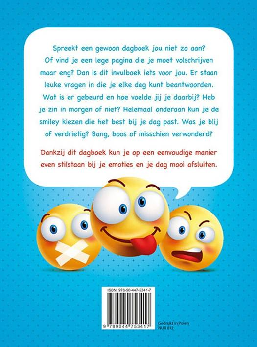 Spreekt een gewoon dagboek jou niet zo aan? Of vind je een lege pagina die je moet volschrijven maar eng? Dan is dit invulboek iets voor jou. Er staan leuke vragen in die je elke dag kunt beantwoorden. Wat is er gebeurd en hoe voelde jij je daarbij? Heb je zin in morgen of niet? Helemaal onderaan kun je de smiley kiezen die het best bij je dag past. Was je blij of verdrietig? Of deed je misschien een beetje gek? Dankzij dit dagboek kun je op een eenvoudige manier even stilstaan bij je emoties en je dag mooi afsluiten.