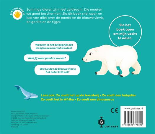 In dit deel komen er wel heel bijzondere dieren aan bod. Heb je altijd al een tijger of een blauwe vinvis willen aaien? In 'Zo voelt een zeldzaam dier' kunnen lezers met hun kleine vingertjes precies voelen hoe pluizig een bij is, en kunnen ze een grote gevaarlijke ijsbeer of een stoere gorilla van dichtbij bestuderen. Neem ook eens een kijkje onder de grote flappen: zo ziet de binnenkant van een tijgergrot of pandanest eruit! Alle prachtige dieren in dit boekje hebben het moeilijk en verdienen extra bescherming van mensen. Kinderen leren hoe we dit samen kunnen doen, en wat deze dieren nodig hebben om veilig en vrij te kunnen leven. Informatief en eerlijk, maar vooral optimistisch, toegankelijk en heel erg leuk!