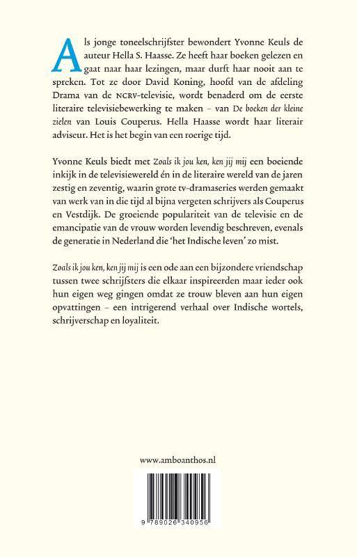 'Zoals ik jou ken, ken jij mij' is een ode aan een bijzondere vriendschap tussen twee schrijfsters die elkaar inspireerden maar ieder ook hun eigen weg gingen omdat ze trouw bleven aan hun eigen opvattingen. Een intrigerend verhaal over Indische wortels, schrijverschap en loyaliteit.
