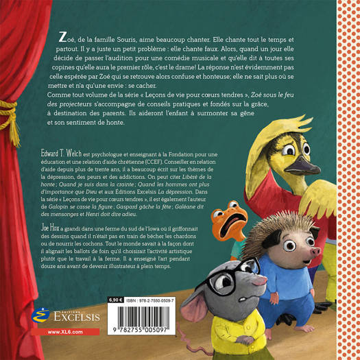 Zoé, de la famille Souris, aime beaucoup chanter. Elle chante tout le temps et partout. Il y a juste un petit problème : elle chante faux. Alors, quand un jour elle décide de passer l’audition pour une comédie musicale et qu’elle dit à toutes ses copines qu’elle aura le premier rôle, c’est le drame ! La réponse n’est évidemment pas celle espérée par Zoé qui se retrouve alors confuse et honteuse , elle ne sait plus où se mettre et n’a qu’une envie : se cacher. Comme tout volume de la série « Leçons de vie pour coeurs tendres », Zoé sous le feu des projecteurs s’accompagne de conseils pratiques et fondés sur la grâce, à destination des parents. Ils aideront l’enfant à surmonter sa gêne et son sentiment de honte.
