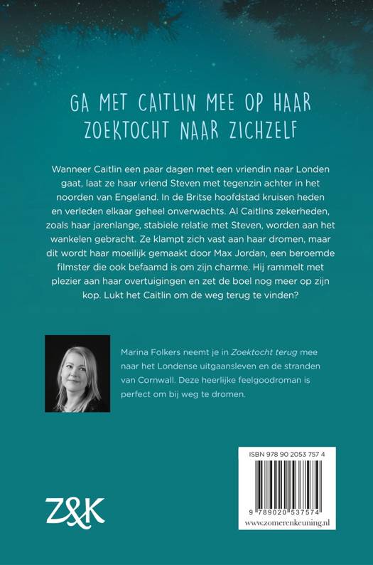 Marina Folkers neemt de lezer in de feelgoodroman 'Zoektocht terug' mee naar het Londense uitgaansleven en de stranden van Cornwall. Eerder verschenen van haar hand 'Onder de sterren van Montpellier', 'Meer dan ooit' en haar debuut 'Faye en Sean'.