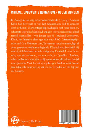 Andreas Klein, het literaire alter ego van oud-AKO Literatuurprijswinnaar Hans Münstermann, 'de meester van de emotie', is zevenenzeventig jaar en legt elke ochtend vast wat hij zich herinnert van de vorige dag. De eindeloze verbouwing van de badkamer, een evacuatie, sterfgevallen, blunders, relatieproblemen met zijn veel jongere vrouw, de bokswedstrijd van zijn zoon. Vaak hapert zijn geheugen. In deze mist doemt één liefdevolle herinnering uit een ver verleden op die hij vast wil houden. ZOLANG DE ZON NOG SCHIJNT is een opgewekte, persoonlijke roman over wat het betekent om ouder te worden.