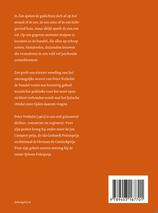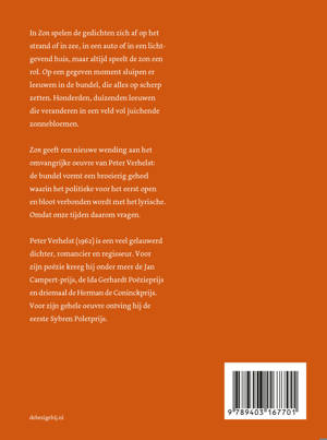 ZON geeft een nieuwe wending aan het omvangrijke oeuvre van Peter Verhelst: de bundel vormt een broeierig geheel waarin het politieke voor het eerst open en bloot verbonden wordt met het lyrische. Omdat onze tijden daarom vragen.