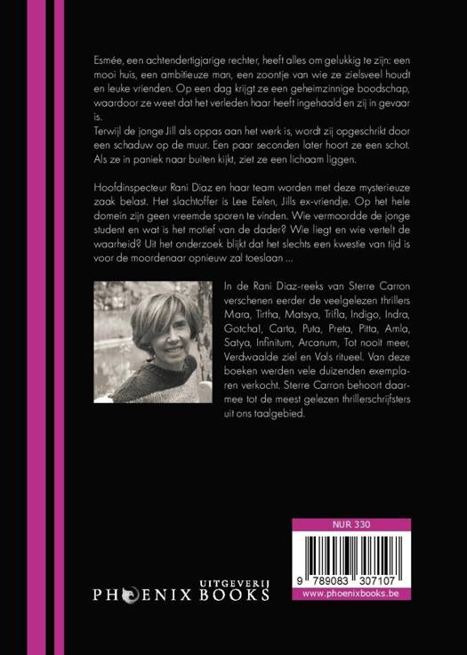 In de Rani Diaz-reeks van Sterre Carron verschenen eerder de veelgelezen thrillers Mara, Tirtha, Matsya, Trifla, Indigo, Indra, Gotcha!, Carta, Puta, Preta, Pitta, Amla, Satya, Infinitum, Arcanum, Tot nooit meer, Verdwaalde ziel en Vals ritueel. Van deze boeken werden vele duizenden exemplaren verkocht. Sterre Carron behoort daarmee tot de meest gelezen thrillerschrijfsters uit ons taalgebied.