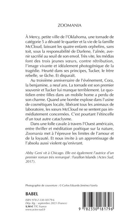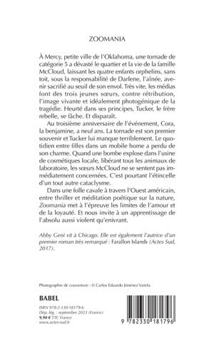 À Mercy, petite ville de l'Oklahoma, une tornade de catégorie 5 a dévasté le quartier et la vie de la famille McCloud, laissant les quatre enfants orphelins, sans toit, sous la responsabilité de Darlene, l'aînée, avenir sacrifié au seuil de son envol. Très vite, les médias font des trois jeunes soeurs, contre rétribution, l'image vivante et idéalement photogénique de la tragédie. Heurté dans ses principes, Tucker, le frère rebelle, se fâche. Et disparaît. Au troisième anniversaire de l'événement, Cora, la benjamine, a neuf ans. La tornade est son premier souvenir et Tucker lui manque terriblement. Le quotidien entre filles dans un mobile home a perdu de son charme. Quand une bombe explose dans l'usine de cosmétiques locale, libérant tous les animaux de laboratoire, les soeurs McCloud ne se sentent pas immédiatement concernées. C'est pourtant l'étincelle d'un tout autre cataclysme. Dans une folle cavale à travers l'Ouest américain, entre thriller et méditation poétique sur la nature, "Zoomania" met à l'épreuve les limites de l'amour et de la loyauté. Et nous invite à un apprentissage de l'absolu aussi violent qu'enivrant.