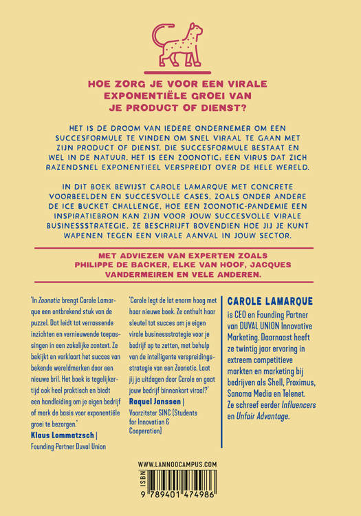 In dit boek bewijst Carole Lamarque met concrete voorbeelden en succesvolle cases, zoals onder andere de Ice Bucket Challenge, hoe een Zoonotic-pandemie een inspiratiebron kan zijn voor jouw succesvolle virale businessstrategie. Ze beschrijft bovendien hoe jij je kunt wapenen tegen een virale aanval in jouw sector.