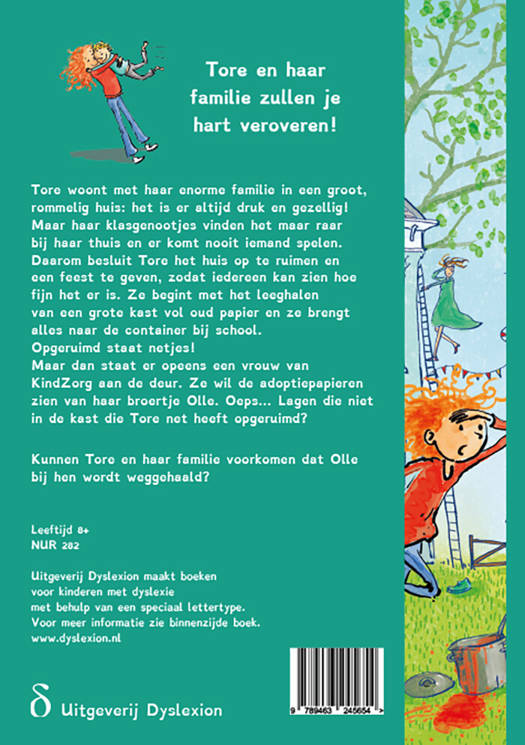 Tore woont met haar enorme familie in een groot, rommelig huis: het is er altijd druk en gezellig! Maar haar klasgenootjes vinden het maar raar bij haar thuis en er komt nooit iemand spelen. Daarom besluit Tore het huis op te ruimen en een feest te geven, zodat iedereen kan zien hoe fijn het er is. Ze begint met het leeghalen van een grote kast vol oud papier en ze brengt alles naar de container bij school. Opgeruimd staat netjes!Maar dan staat er opeens een vrouw van KindZorg aan de deur. Ze wil de adoptiepapieren zien van haar broertje Olle. Oeps… Lagen die niet in de kast die Tore net heeft opgeruimd? Kunnen Tore en haar familie voorkomen dat Olle bij hen wordt weggehaald?