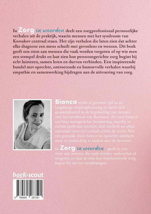 In Zorg in woorden deelt een zorgprofessional persoonlijke verhalen uit de praktijk, waarin mensen met het syndroom van Korsakov centraal staan. Het zijn verhalen die laten zien dat achter elke diagnose een mens schuilt met gevoelens en wensen. Dit boek geeft een stem aan mensen die vaak worden vergeten of op wie men een stempel drukt en laat zien hoe persoonsgerichte zorg begint bij echt luisteren, samen leren en durven verbinden. Een inspirerende bundel met oprechte, ontroerende en humorvolle verhalen waarbij empathie en samenwerking bijdragen aan de uitvoering van zorg.