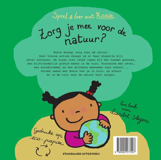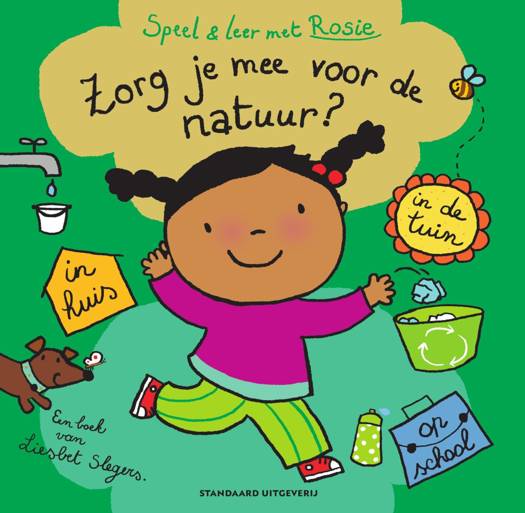 Rosie draagt zorg voor de natuur. Door kleine acties draagt ze al haar steentje bij: afval sorteren, de kraan niet laten lopen bij het tanden poetsen, een bijvriendelijk plekje maken in de tuin, knutselen met afval, een broodtrommel en een drinkbus meenemen naar school, … Ontdek samen met Rosie hoe je in huis, op school en in de tuin voor de natuur kunt zorgen.