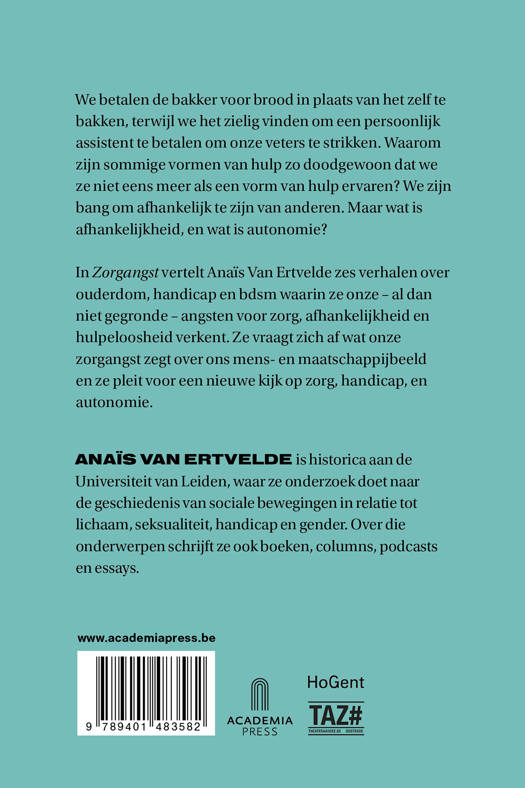 In Zorgangst vertelt Anaïs Van Ertvelde zes verhalen over ouderdom, handicap en bdsm waarin ze onze - al dan niet gegronde - angsten voor zorg, afhankelijkheid en hulpeloosheid verkent. Ze vraagt zich af wat onze zorgangst zegt over ons mens- en maatschappijbeeld en ze pleit voor een nieuwe kijk op zorg, handicap, en autonomie.