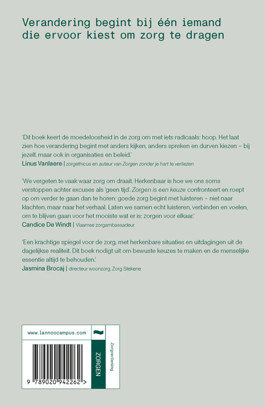 'Dit boek keert de moedeloosheid in de zorg om met iets radicaals: hoop. Het laat zien hoe verandering begint met anders kijken, anders spreken en durven kiezen - bij jezelf, maar ook in organisaties en beleid.' - Linus Vanlaere | zorgethicus en auteur van Zorgen zonder je hart te verliezen 'We vergeten te vaak waar zorg om draait. Herkenbaar is hoe we ons soms verstoppen achter excuses als 'geen tijd'. Zorgen is een keuze confronteert en roept op om verder te gaan dan te horen: goede zorg begint met luisteren - niet naar klachten, maar naar het verhaal. Laten we samen echt luisteren, verbinden en voelen, om te blijven gaan voor het mooiste wat er is: zorgen voor elkaar.' - Candice De Windt | Vlaamse zorgambassadeur 'Een krachtige spiegel voor de zorg, met herkenbare situaties en uitdagingen uit de dagelijkse realiteit. Dit boek nodigt uit om bewuste keuzes te maken en de menselijke essentie altijd te behouden.' - Jasmina Brocaj | directeur woonzorg, Zorg Stekene