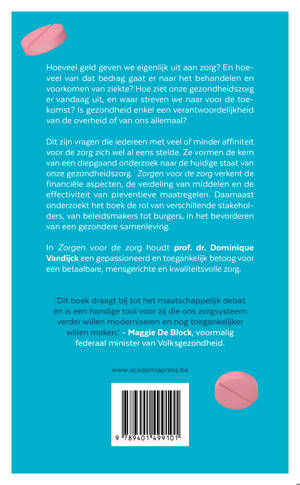 Hoeveel geld geven we eigenlijk uit aan zorg? En hoeveel van dat bedrag gaat er naar het behandelen en voorkomen van ziekte? Hoe ziet onze gezondheidszorg er vandaag uit, en waar streven we naar voor de toekomst? Is gezondheid enkel een verantwoordelijkheid van de overheid of van ons allemaal? Dit zijn vragen die iedereen met veel of minder affiniteit voor de zorg zich wel al eens stelde. Ze vormen de kern van een diepgaand onderzoek naar de huidige staat van onze gezondheidszorg. Zorgen voor de zorg verkent de financiële aspecten, de verdeling van middelen en de effectiviteit van preventieve maatregelen. Daarnaast onderzoekt het boek de rol van verschillende stakeholders, van beleidsmakers tot burgers, in het bevorderen van een gezondere samenleving. In Zorgen voor de zorg houdt prof. dr. Vandijck een gepassioneerd en toegankelijk betoog voor een betaalbare, mensgerichte en kwaliteitsvolle zorg.