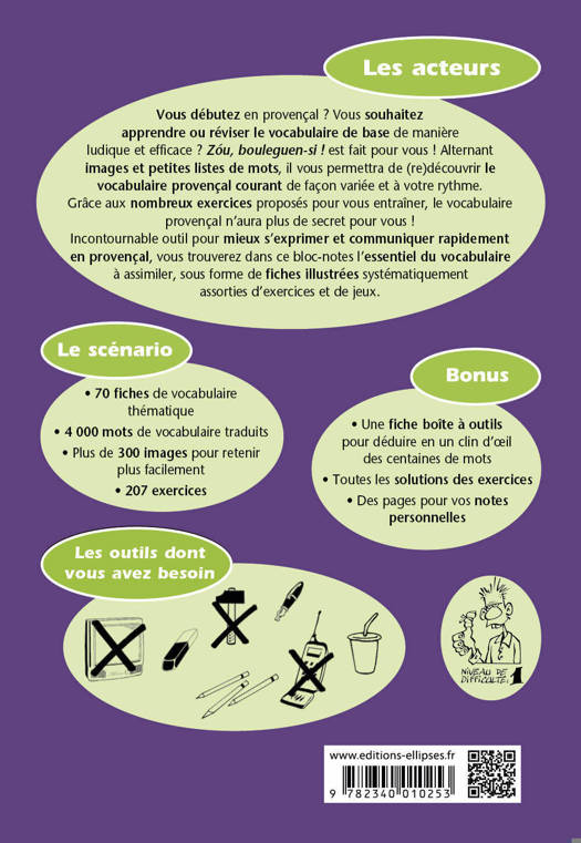 Vous débutez en provençal ? Vous souhaitez apprendre ou réviser le vocabulaire de base de manière ludique et efficace ? Zóu, bouleguen-si ! est fait pour vous ! Alternant images et petites listes de mots, il vous permettra de (re)découvrir le vocabulaire provençal courant de façon variée et à votre rythme.
