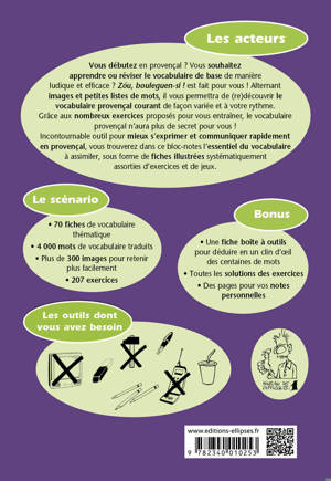Grâce aux nombreux exercices proposés pour vous entraîner, le vocabulaire provençal n’aura plus de secret pour vous ! Incontournable outil pour mieux s’exprimer et communiquer rapidement en provençal, vous trouverez dans ce bloc-notes l’essentiel du vocabulaire à assimiler, sous forme de fiches illustrées systématiquement assorties d’exercices et de jeux.