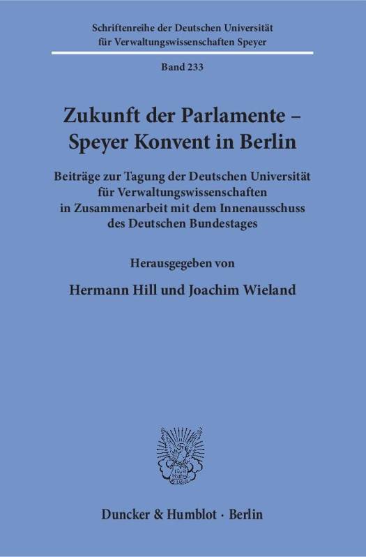 Beim 1. Speyer Konvent in Berlin erörterten Dozentinnen und Dozenten aus der Universität und dem Forschungsinstitut Speyer aktuelle Fragen zur Zukunft der Parlamente. Neben interdisziplinären Überlegungen zur aktuellen Situation und zu bestehenden Spannungsfeldern der Parlamente in Deutschland, Italien und Großbritannien setzten sich die Autoren auch mit dem Einfluss von neuen Herausforderungen wie der Globalisierung, der VUCA World (Volatility, Uncertainty, Complexity, Ambiguity) und der Nutzung algorithmischer Verfahren auseinander. Die innerdeutsche Perspektive ist zudem abgebildet durch Überlegungen zur Rolle der Parlamente in der Funktionsordnung des Grundgesetzes, zum Verhältnis der repräsentativen Demokratie zur Bürgerbeteiligung, zum parlamentarischen Einfluss während der Flüchtlingskrise und zum Umgang mit dem demografischen Wandel.