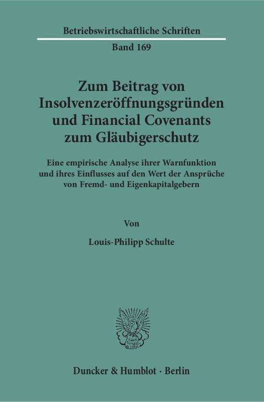 Der Bedarf Gläubiger zu schützen ergibt sich aus ihrer von Eigentümern abweichenden Rechtsstellung. Daher ist die Diskussion der Möglichkeiten, Gläubiger vor dem Zahlungsausfall eines Schuldners zu schützen, untrennbar mit der Kreditvergabe verbunden. Louis-Philipp Schulte untersucht das gesetzliche Gläubigerschutzinstrument der Insolvenzeröffnungsgründe sowie das privatrechtliche Gläubigerschutzinstrument der Financial Covenants empirisch. Insbesondere analysiert er welche Faktoren im Rahmen eines Insolvenzverfahrens Einfluss auf den Forderungswert haben und wie sich ein Insolvenzantrag auf den Wert der Ansprüche von Gläubigern und Eigentümern auswirkt. Anschließend geht er der Frage nach, inwieweit Financial Covenants Gläubigern ein rechtzeitiges Warnsignal vor dem Wertverlust einer Forderung geben können und ob sich aus Financial Covenants eine Information bezüglich der Werthaltigkeit von Forderungen ableiten lässt.