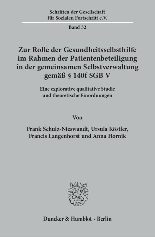 Das vorliegende Buch ist als Ergebnis des Kölner Moduls eines vom BMG geförderten Forschungsprojekts im Forschungsnetzwerk mit der Universität Hamburg und der Universität Hannover zur Wirkungsanalyse der Gesundheitsselbsthilfe in Deutschland (SHILD III) ein Beitrag zur Analyse der Mitwirkung der Selbsthilfe in der Patientenbeteiligung nach 140f SGB V in Gremien des G-BA im Rahmen der kollektiven Selbstverwaltung. Die institutionellen und rechtlichen Konstruktionen beachtend, wird auf der Basis einer Literaturanalyse und eines qualitativen Mixed-Methods-Design interdisziplinär theoriefundiert und hypothesengeleitet und zugleich in abduktiver Offenheit ein explorativer Einblick in die Kultur der Rolle der Selbsthilfe in diesem korporatistischen Regime erarbeitet. Dabei stehen Ambivalenzaspekte in der Einschätzung im Vordergrund. Der Beitrag versteht sich als kritische Exploration einer kulturellen Grammatik des Geschehens.